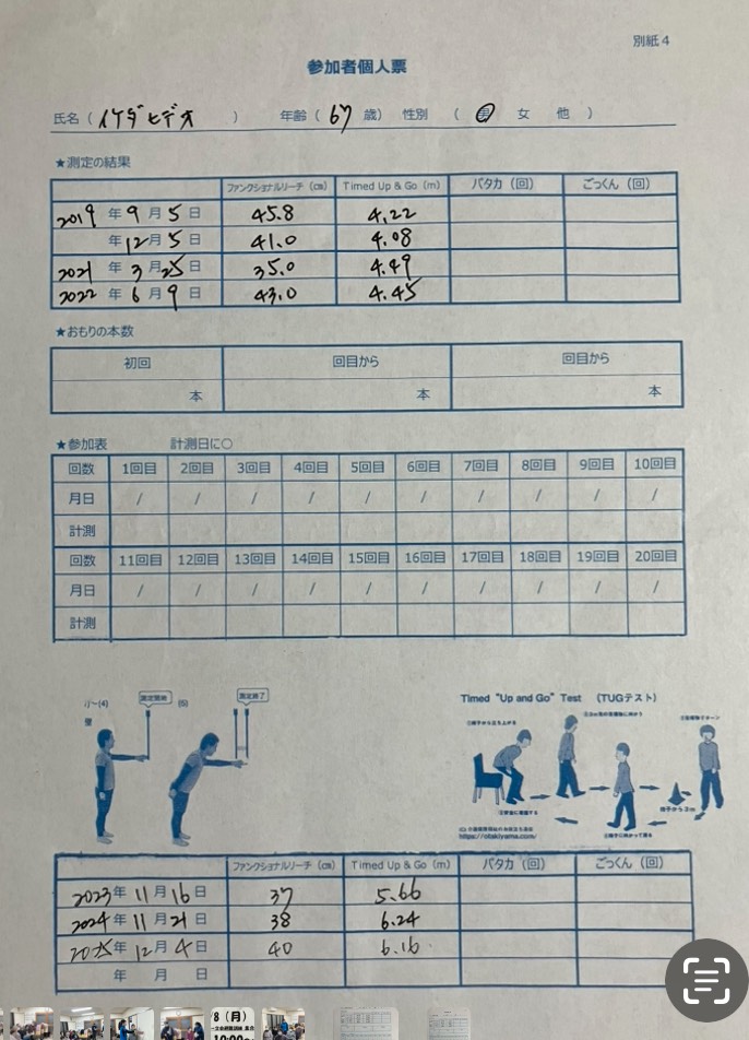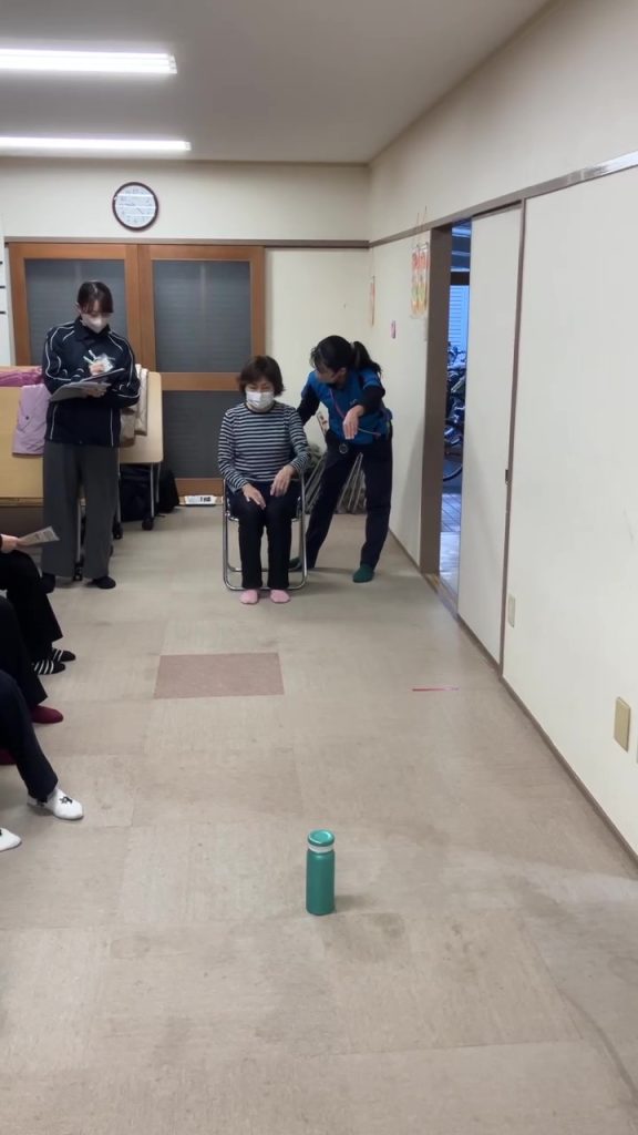 もう一つは、椅子から立上がって3メートル歩き、180度回転し、椅子に戻って、座るのにかかる時間を測定しました。(TUG測定)