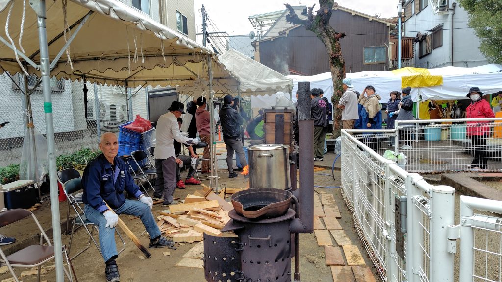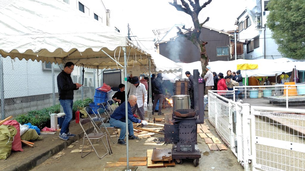 一週間延期になった北二北中町会の餅つき大会が10時から加賀屋天満宮境内で行なわれました。