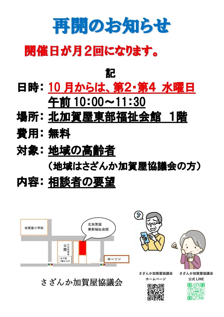 北加賀屋東部福祉会館でお待ちしています。