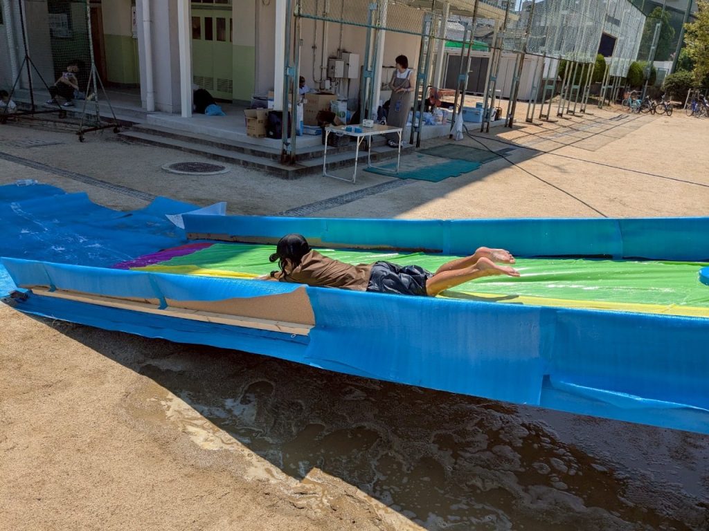 ウォーターサバゲーをはじめ、的当て・スーパーボールすくいなど去年も行なったゲームはもちろん、今年はウォータースライダーも手作りして楽しみました。
