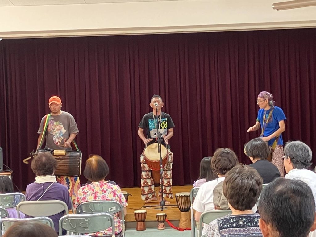 ジャララんべというアフリカの太鼓を叩いて、みんなで手拍子、足拍子!子どもさんも太鼓叩いて大はしゃぎ!最後は、みんなノリノリ、色々な楽器を叩いて笑顔いっぱいのコンサートでした。